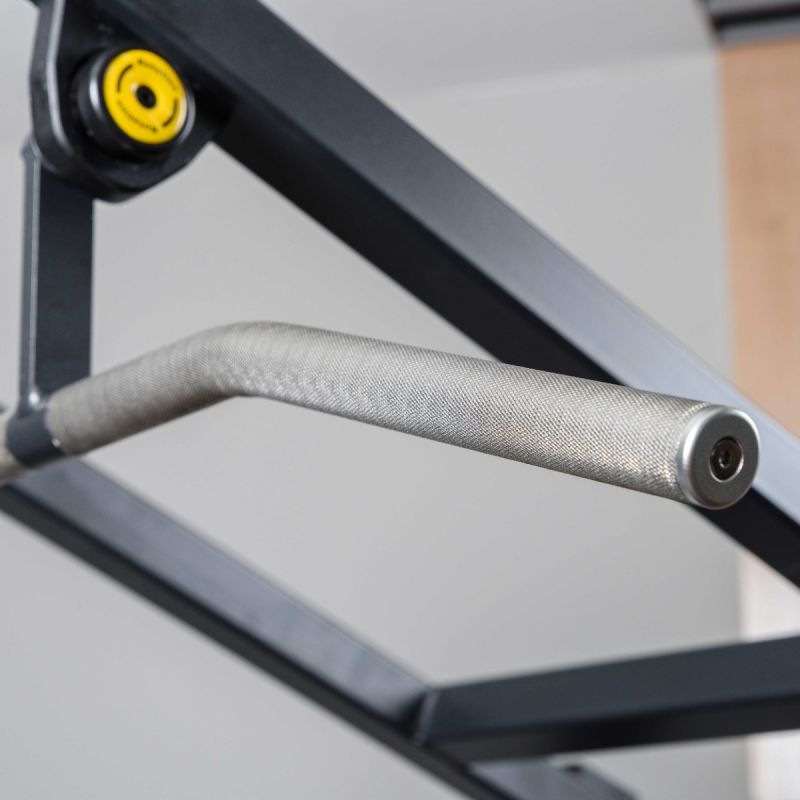 - Основная рукоять представляет собой цельную конструкцию длиной 1210 мм из металлического прутка диаметром 30 мм с мягкой ромбовидной накаткой. Рукоять установлена на подшипниковых узлах и перемещается по дугообразной траектории, что обеспечивает естественный ход движения и правильную биомеханику упражнения. Торцы рукояти закрыты металлическими заглушками с болтовой фиксацией.