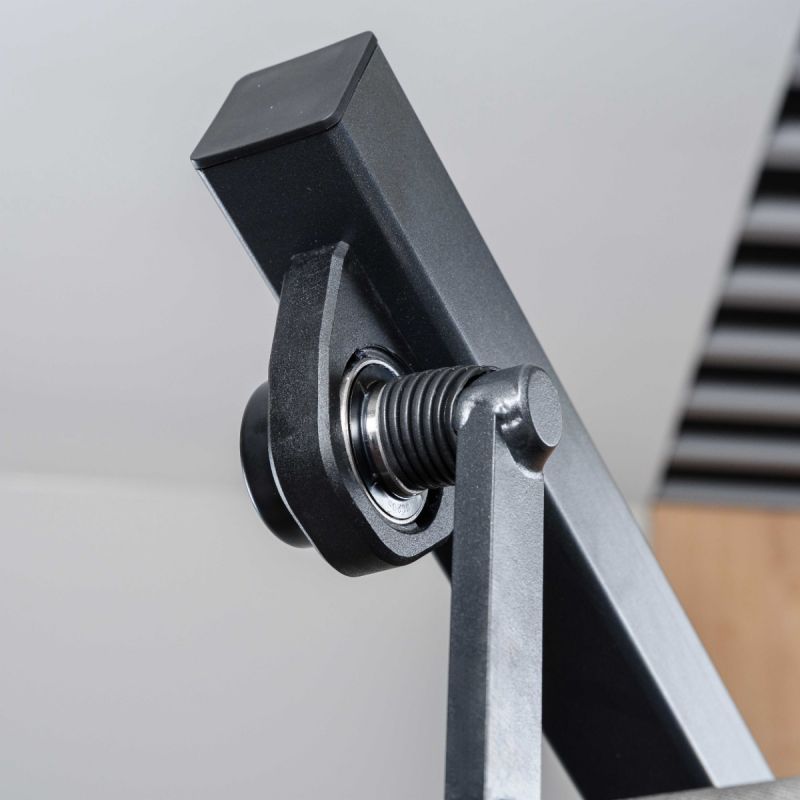 - Подвижный рычаг снабжён встроенным противовесом, компенсирующим начальную массу конструкции и обеспечивающим лёгкий старт без дополнительных дисков – это повышает комфорт и снижает нагрузку на плечевые суставы в начале упражнения.