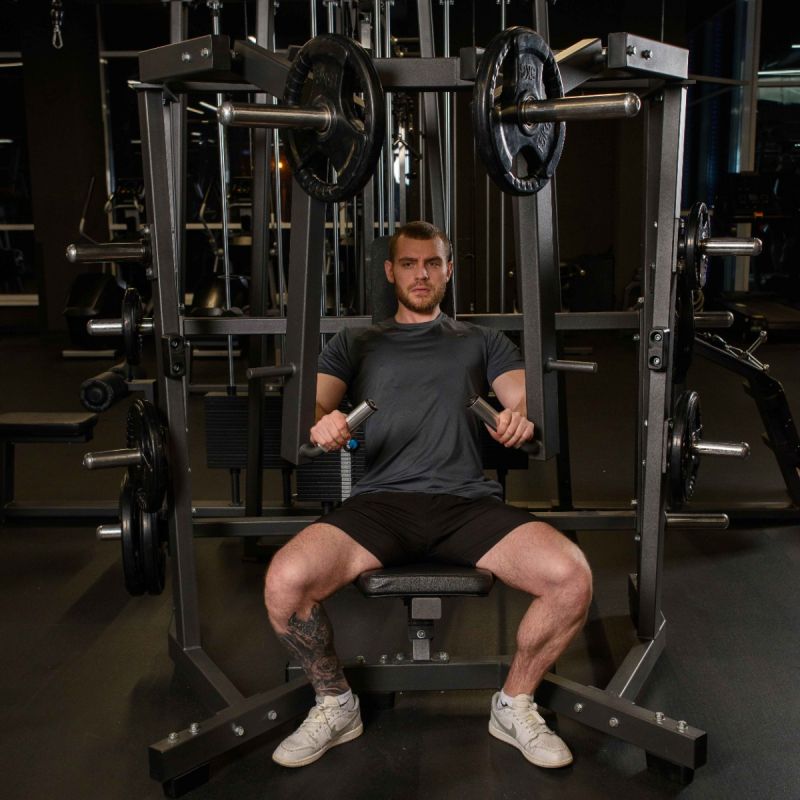 Жим от груди широким хватом максимально нагружает большие грудные мышцы и практически исключает из работы трицепсы. Рукоятки расположены шире, а траектория движения рукояток более сходящаяся, в сравнении с тренажером Независимый жим на низ груди, поэтому занятия на тренажере подойдут опытным спортсменам с широкой грудью.