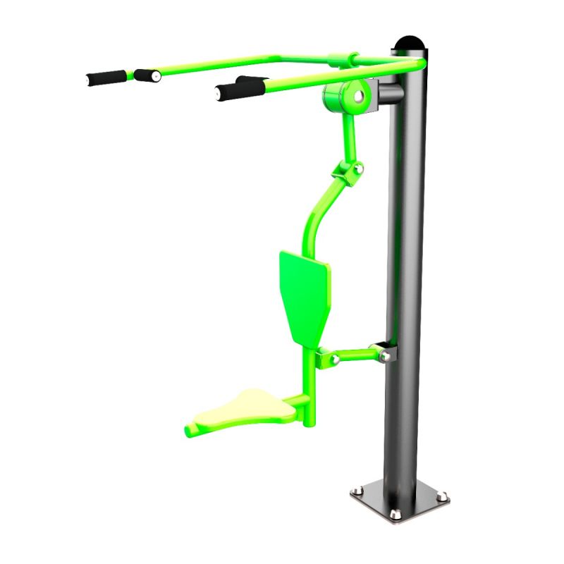 Тренажёр задействует широчайшие мышцы спины, бицепсы и плечевой пояс. Движение выполняется сидя, с опорой для спины и ног, за счёт тяги рукоятей сверху вниз. Конструкция с подвижным сиденьем обеспечивает плавную и безопасную траекторию. Подходит для пользователей разных возрастов и уровней подготовки.